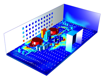 Modulen för värmeöverföring, som används bland annat för att simulera hur elektronikkonstruktioner kyls (se bild nedan) och hur fläktar och kylflänsar ändrar de termiska egenskaperna, har också snabbats upp. En ny finess är här möjligheten att simulera "oändligheten", alltså att virtuellt lägga ett randvillkor oändligt långt bort.