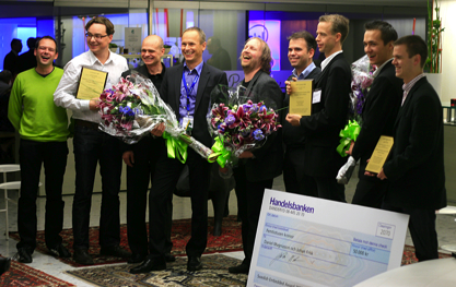 Glädjestrålande pristagare - från vänster Håkan Johansson och Jonas Olsson från Informasic, Dag Tryggö, Loxystems, Leif Åkesson, Informasic, Jan-Erik Strömberg, David Steen och Magnus Sundstedt från DST Systems samt Daniel Magnusson och Johan Frisk från KTH.
