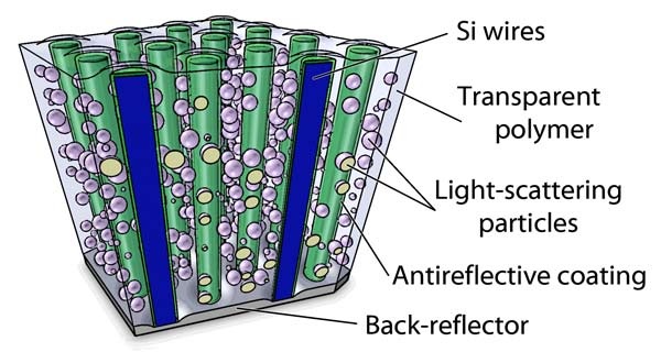 Ett forskarlag vid Caltech under ledning av Harry Atwater har valt en annan väg, skriver tidningen Technology Review. De har tagit fram ett material där ljusabsorberande mikrotrådar i kisel samsas med ljusreflekterande nanopartiklar i aluminium, allt inbäddat i en polymer. Tidiga beräkningar indikerar att detta material skulle kunna ge solceller med en verkningsgrad på 15–20 procent, alltså fullt i klass med de bästa på marknaden idag. Samtidigt används bara någon hundradel så mycket material som i dagens solceller, vilket kan ge rejäla kostnadsfördelar.