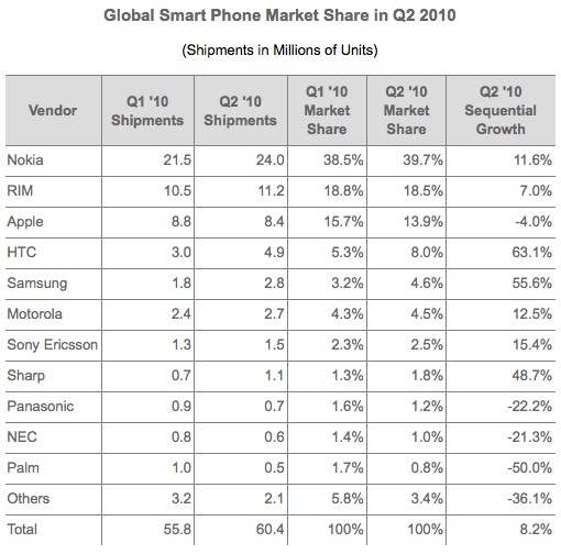 Sony Ericsson gick också framåt, även om siffrorna bleknar jämte Nokias. Sony Ericsson levererade 1,5 miljoner smartmobiler under årets andra kvartal, upp från 1,3 miljoner första kvartalet.