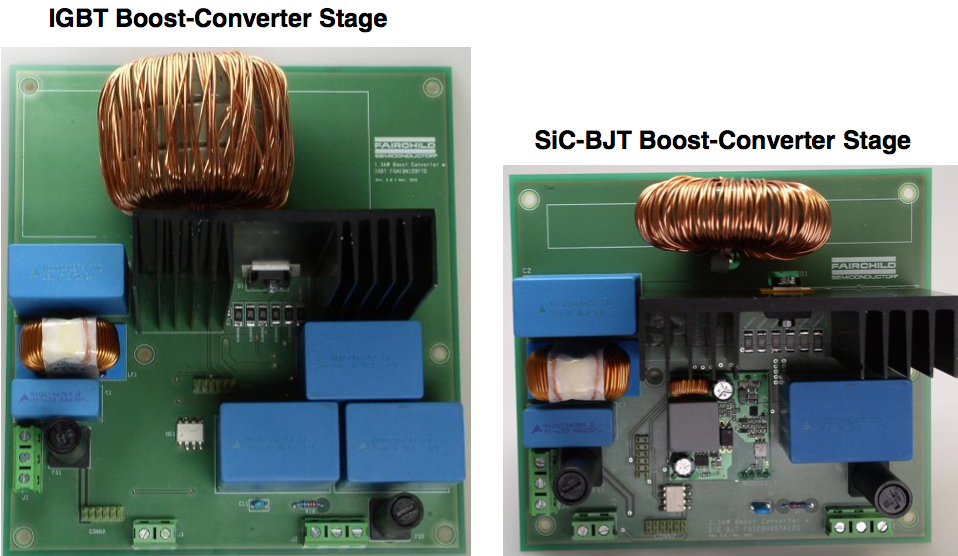Storleksjämförelse mellan IGBT-konstruktion och Fairchilds BTJ-lösning med samma prestanda. Framförallt är skillnaden i vikt påtaglig, vilket dock inte syns på bilden.