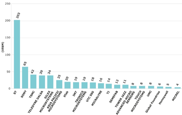 20-i-topp-listan över världens största memsfoundryn - 2012 (källa: Yole Developpement, April 2013)