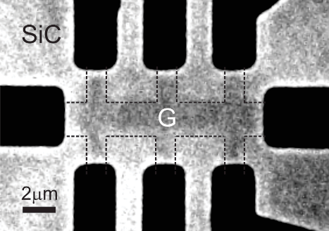 | Med ett optiskt mikroskop går det att hitta ytor som bara består av ett lager grafen – det är där den riktiga karaktäristiken för materialet kommer fram och det kan därför vara intressant att placera komponenter på just dessa ställen. Bilden visar hur en så kallad Hall bar placerats på en yta med ett lager grafen. |