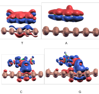 Fördelningar av elektriska laddningar mellan olika kväve baser och silicen, där det inte blir någon växelverkan med tymin och adenin (överst), medan det uppstår en växelverkan med cytosin och guanin (underst).