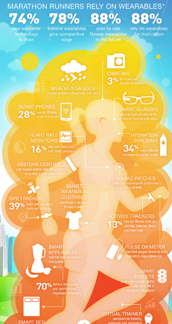 | Maratonlöpare tror att bärbar elektronik hjälper dem till framgång – det blev tydligt i –Freescales undersökning av 500 aktiva löpare som tränare för -maraton och som redan använder någon form av elektronik. Av de tillfrågade använder redan 74 procent elektronik (wearable techno-logy) i sin träning, medan 88 procent planerar att göra det. Samtidigt ansåg 78 procent att elektroniken ger dem en konkurrensfördel, medan 88 procent använder tekniken för att motivera sig. Figuren avslöjar vad löparna önskar sig av den bärbara elektroniken för att nå bättre resultat. |