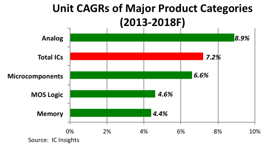 Främst är det lysdiodsbelysning och smart effekthantering som banar väg för analoga analoga halvledare då de är energieffektiva. Den ökande efterfrågan på LED-belysning inom industrin, i hemmen och på allmänna platser driver på en ökad användning av analoga kretsar, hävdar IC Insight.