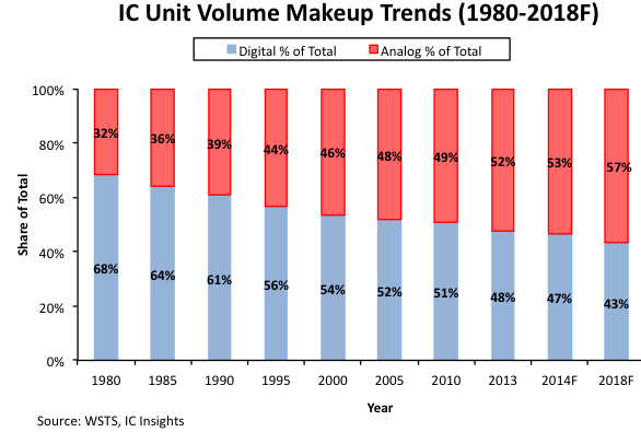 I pressmeddelandet från IC Insight skriver företaget inget om hur den långlivade trenden med allt högre integrationsgrad på framförallt digitalsidan påverkat utvecklingen. Rimligen har den det eftersom analoga funktioner ofta inte kan integreras på samma sätt som digitala. Analogt kan exempelvis kräva helt andra processer än klassisk CMOS.