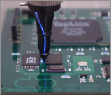 | Genom att lysa under en BGA-krets kan lödpunkterna inspekteras med Optilias BGA-prob. Förstoringen kan varieras mellan 5 och 350 gånger. |