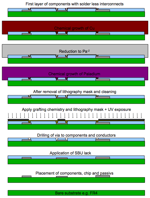 | Steg för steg – nedifrån och upp – hur den lödfria förbindningen kan skapas. Först limmas kretsarna på substratet, därefter appliceras ett dielektriskt SBU-lager (sequential build up). I nästa steg borras hål till kretsarna och Cuptronics kemi adderas. När allt torkat läggs en fotomask på ytan som exponeras av UV-ljus. I olika steg byggs ledare av paladium och koppar där ljuset exponerat ytan. |