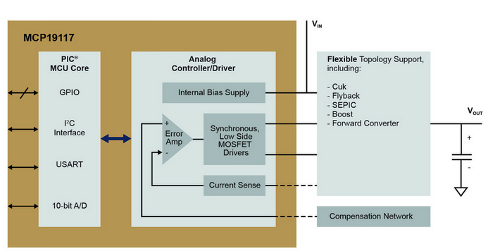 Microchips senaste tillskott inom detta gebit är de två kretsarna MCP19116 och MCP19117, som båda innehåller en PWM-styrenhet och en PIC-processorkärna. Den analoga styrenhetens uppgift är att leverera hög effekt och prestanda, medan den digitala delen adderar flexibilitet.