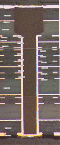 | Bilden visar en snittning av en fyllning av typ 7 för ett genomgående viahål med ”back-drill”. Kortet har 16 lager. |