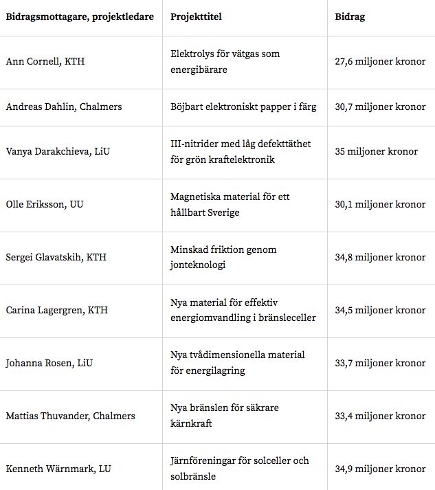 Inom ett annat projekt siktar Kenneth Wärnmark Lunds universitet, på att byta ut dagens dyra och miljöovänliga material i solceller till järnbaserade material. För detta får han 34,9 miljoner.