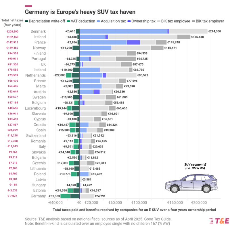 Beskattningen av suvar är enligt T&E ett generellt problem. Företag köper majoriteten av alla suvarna, och andelen är ännu högre för tunga modeller.