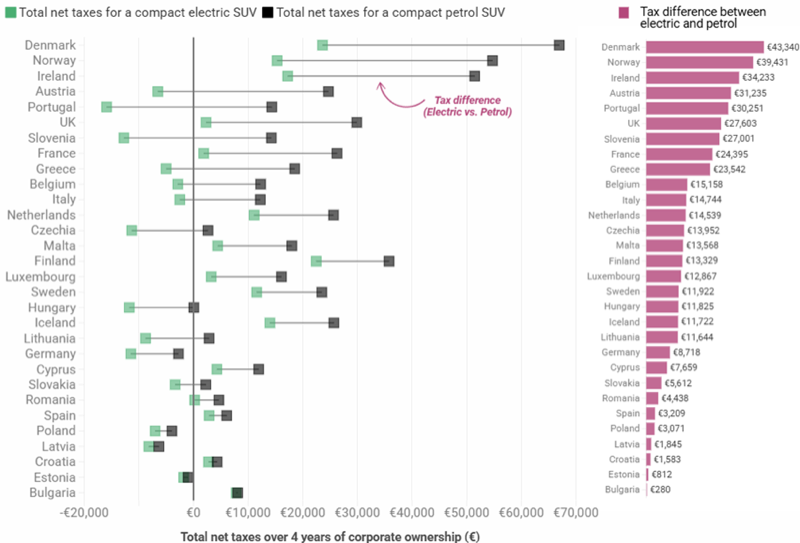 I Sverige är den totala beskattningen 12 000 euro högre för en bensinbil än för en elbil.