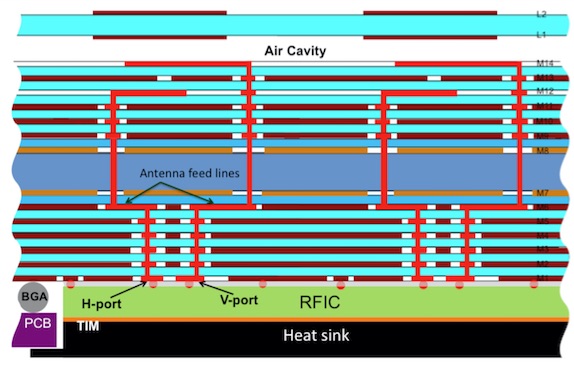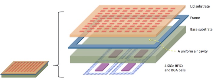 | Bassubstratet består av 14 lager med metalledningar. Här går bland annat de 128 ledningarna från antennelementen till transceiverchipen, som är flipchipade på undersidan av substratet. Alla 128 ledningar har exakt samma längd för att förenkla fasstyrningen av de individuella elementen. Modulen är monterad på ett mönsterkort och under varje rf-chip har en del av mönsterkortet skurits ut för att ge plats åt en kylfläns. Modulen består av tre olika organiska substrat, vilka är inte officiellt. |