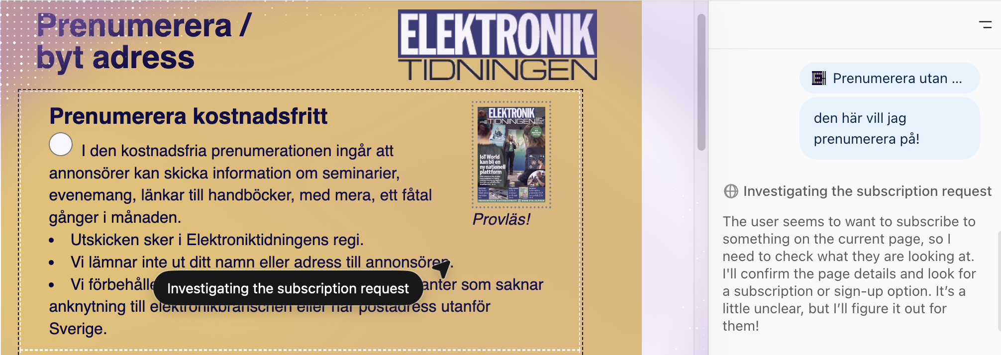 Det första jag testade på Atlas – se bild ovan – var att låta den teckna prenumerationer på Elektroniktidningen på etn.se/pren. För den ska vara en agent – den ska kunna klicka på knappar i webbformulär.