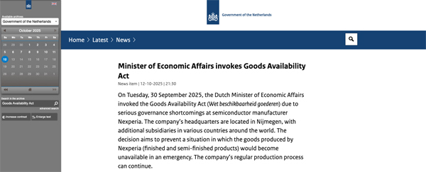 Enligt uppgifter i den nederländska tidningen NRC försökte den kinesiska ägaren till Nexperia rädda sin halvledarfabrik i Shanghai på Nexperias bekostnad. Uppgifterna fick Nederländernas regering att åberopa en krislag och ta över kontrollen av bolaget.