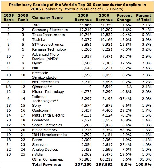 De två företagen som åkt ut från tio-i-topp-topplistan är Infineon och NEC. Infineon intar numera en 14:e plats med omsättningen 5,2 miljarder dollar, men det är naturligt då företaget knoppat av sin minnestillverkning i Qimonda under året. Qimonda hamnar i sin tur på 12:e plats, med en omsättning på 5,5 miljarder dollar.