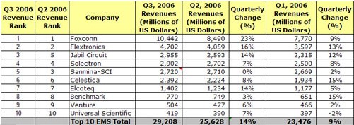 Ohotad etta på Isupplis lista är Foxconn, även känt som Hon Hai Precision, med en försäljing på 10,4 miljarder dollar under tredje kvartalet. Lika ohotad tvåa är Flextronics, vars försäljning stannade vid 4,7 miljarder dollar. Totalt omsatte de tio största kontraktstillverkarna 29,2 miljarder dollar under tredje kvartalet.