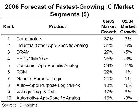 Listan toppas av komparatorer som spås växa med 37 procent vilket är en klar förbättring jämfört med 2005 då tillväxten låg på blygsamma 3 procent. På andra plats hamnar analogkretsar för industri- och andra applikationsspecifika segment med en tillväxt på 31 procent.Tredjeplatsen intas av DRAM som uppvisar en tillväxt på 27 procent. Volymerna har inte ökat nämnvärt i år men däremot har tillverkarna fått bättre betalt. På fjärdeplatsen återfinns EEPROM med 25 procent och på sjätteplatsen ROM med 22 procent. Den lite överraskande starka tillväxten förklarar IC Insights med att dessa minnestyper används i olika spelkonsoler, bland annat Microsofts Xbox 360 och Sonys PS3 men även i handhållna spelkonsoler och en del smarta telefoner.
