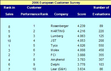 Världens överlägset största kontaktdonsföretag heter Tyco, med Molex som god tvåa. Men det är inte dessa som ger bäst stöd åt kunderna i Europa. Bland de tio bolag som säljer mest toppas i stället listan av tre tyska medelstora företag - Rosenberger, Harting och Lumberg - följt av japanska JST. Allt enligt en undersökning gjord av analyshuset Bishop & Associates. Tyco ligger först på femte plats, skuggat av Molex, FCI och Amphenol.