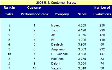 För undersökningen frågade Bishop & Associates 1147 kontaktdonskunder i USA och Europa. Undersökningen omfattade 41 leverantörer, som de svarande fick betygsätta i 13 kategorier. Bland dessa fanns frågor om produktkvalitet, ledtider, pris, support, problemhantering och webbstöd.