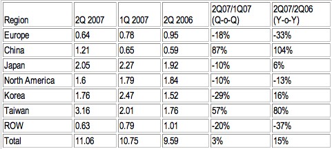 Under andra kvartalet i år såldes utrustning för drygt 11 miljarder dollar, tre procent mer än kvartalet innan, och 15 procent mer än motsvarande kvartal i fjol. Men det intressanta är hur styrkeförhållandet ändras mellan regionerna. Alla regioner i Asien går framåt - Kina med 104 procent, Taiwan med 80 procent, Korea med 15 procent och Japan med 6 procent.