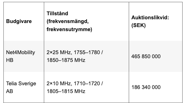 Net4mobility – Telenor och Tele2:s gemensamma bolag – köpte 2×25 MHz, medan Telia köpte 2×10 MHz. Samma band som Telia har idag. Den tredje budgivaren Hi3G Access (operatören Tre) blev utan.