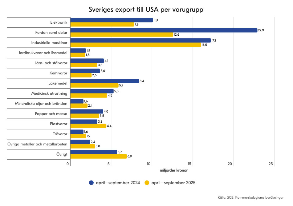 Totalt minskade varuexporten till USA med 17 procent under perioden april-september 2025 jämfört med motsvarande period 2024.