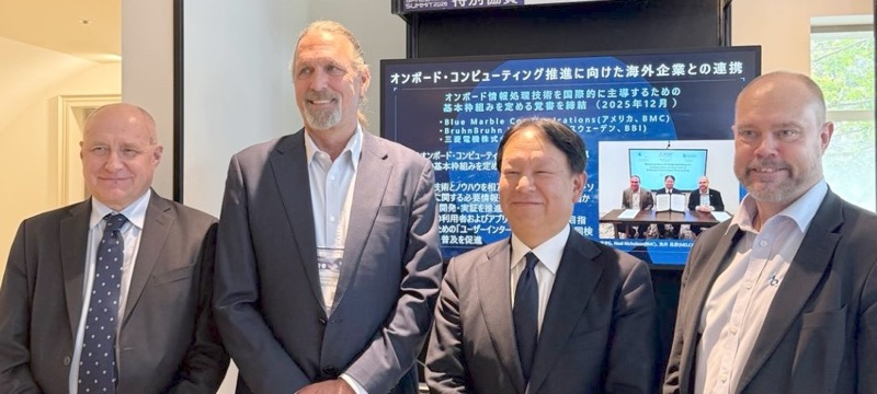 På bild: Mika Ihalainen (Sveriges försvarsattaché i Japan), Neal Nicholson (vd Blue Marble), Wataru Arai (Senior Executive Director, Mitsubishi Electric), Fredrik Bruhn (CTO Bruhn–Bruhn).