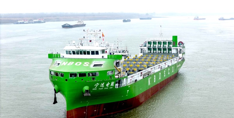 Skeppet heter Ning Yuan Dian Kun och har testats i havet utanför Shanghai. Testerna ska ha varit avslutade i fredags om allt gått enligt plan. Nu ska det i så fall tas i drift på matarlinjer kopplade till hamnkomplexet Ningbo–Zhoushan (världens största hamn mätt i hanterad mängd gods, 1,4 miljarder ton i fjol).