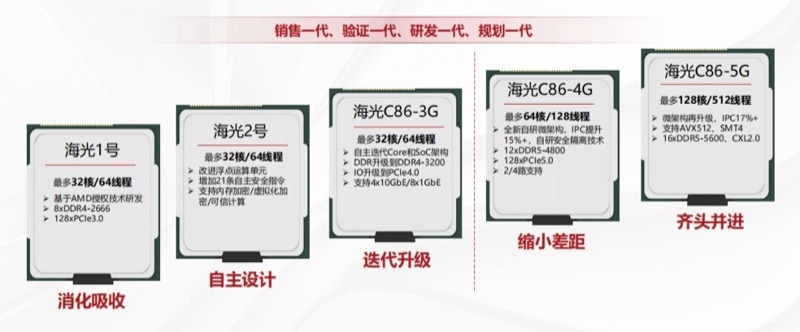 Hygon gör inget väsen av sina x86-processorer. Bilden intill på fem generationer C86 är inte publicerad av Hygon men tyska Heise anser att den är från en trovärdig källa. Den första generationen hade 32 stycken tvåtrådade cpu:er.