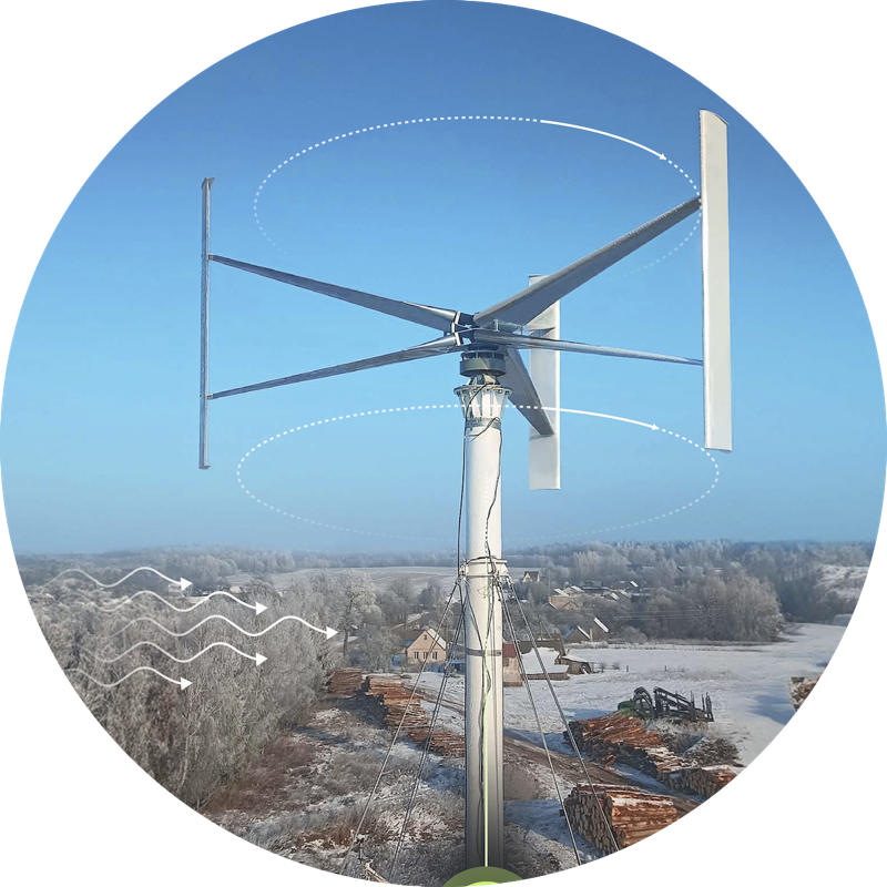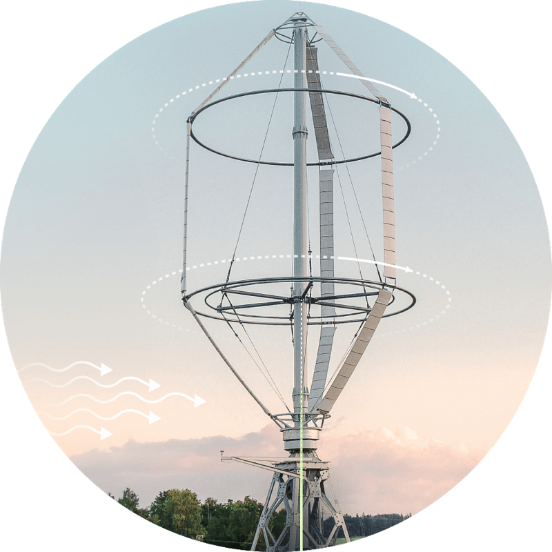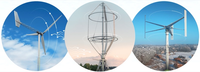 luften. Titta på bilden intill och inse att de inte behöver vrida sig efter vinden. Och att de kan ha alla komponenter utom själva bladen lättåtkomliga på marken. Det gäller även den andra sortens VAWT, Savonius, vars funktionsprincip är lättare att förstå: de är skovelhjul för vind.